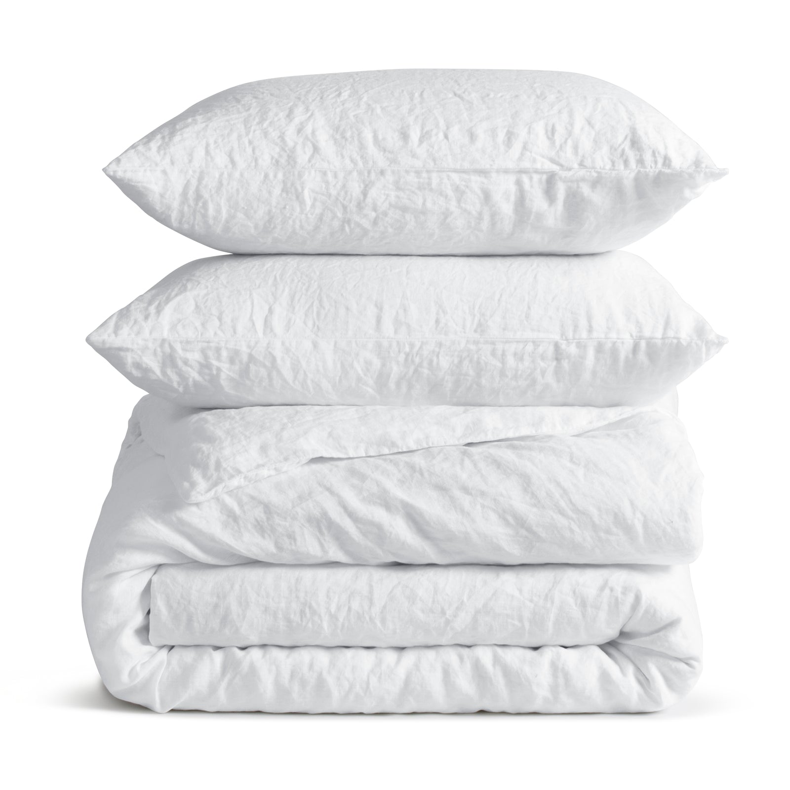 Look forward to winding down in enduring comfort, with this timeless pure white bedding set—slow-made from natural luxury linen.