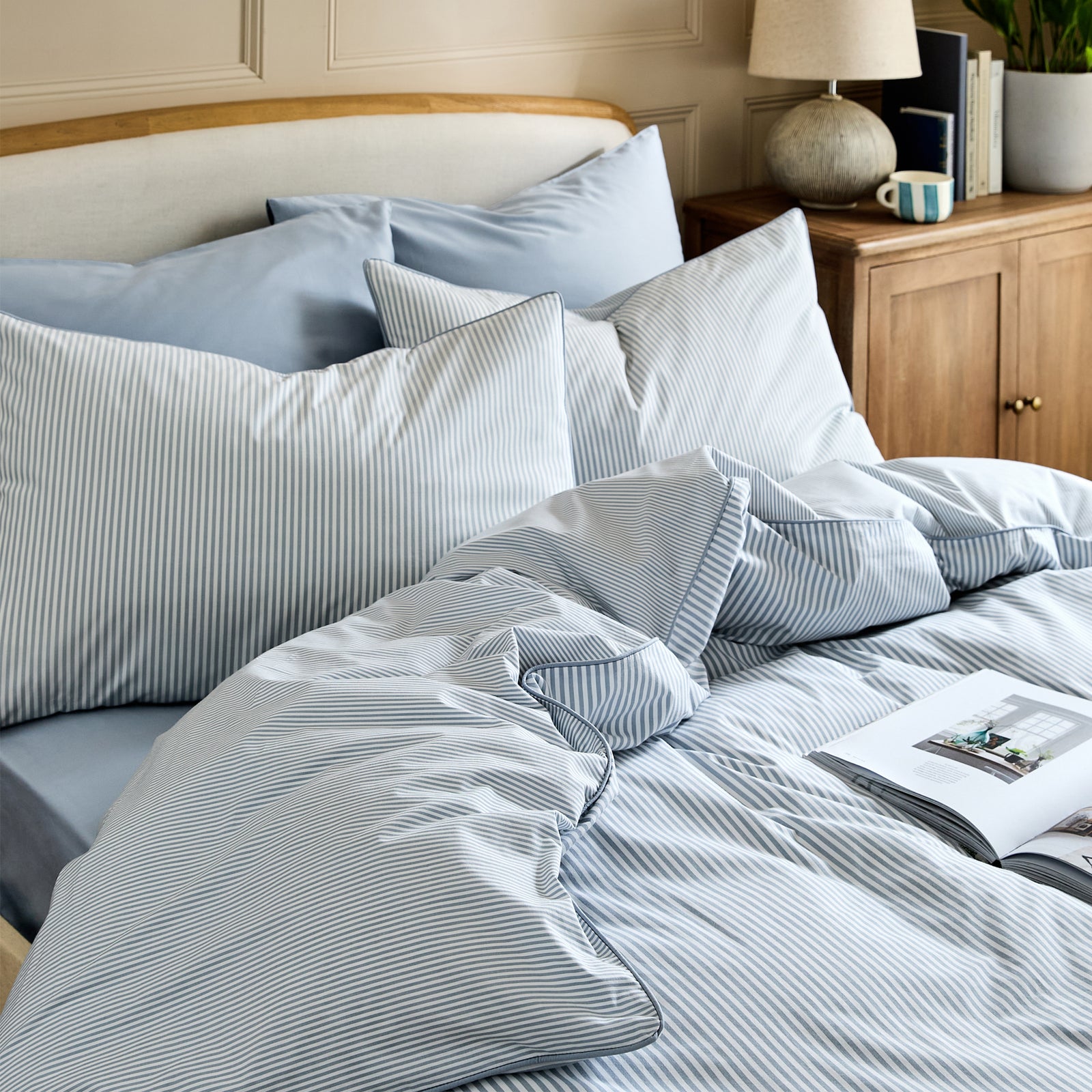 Tuck into this mood-soothing dusky blue striped duvet cover with a soft grey undertone—slow-made from luxury organic cotton.