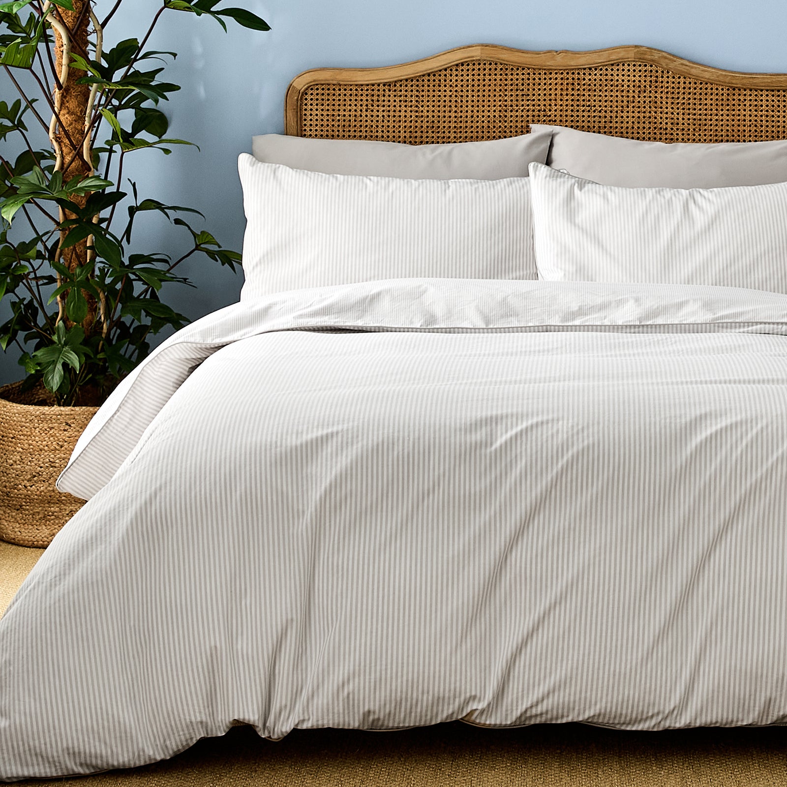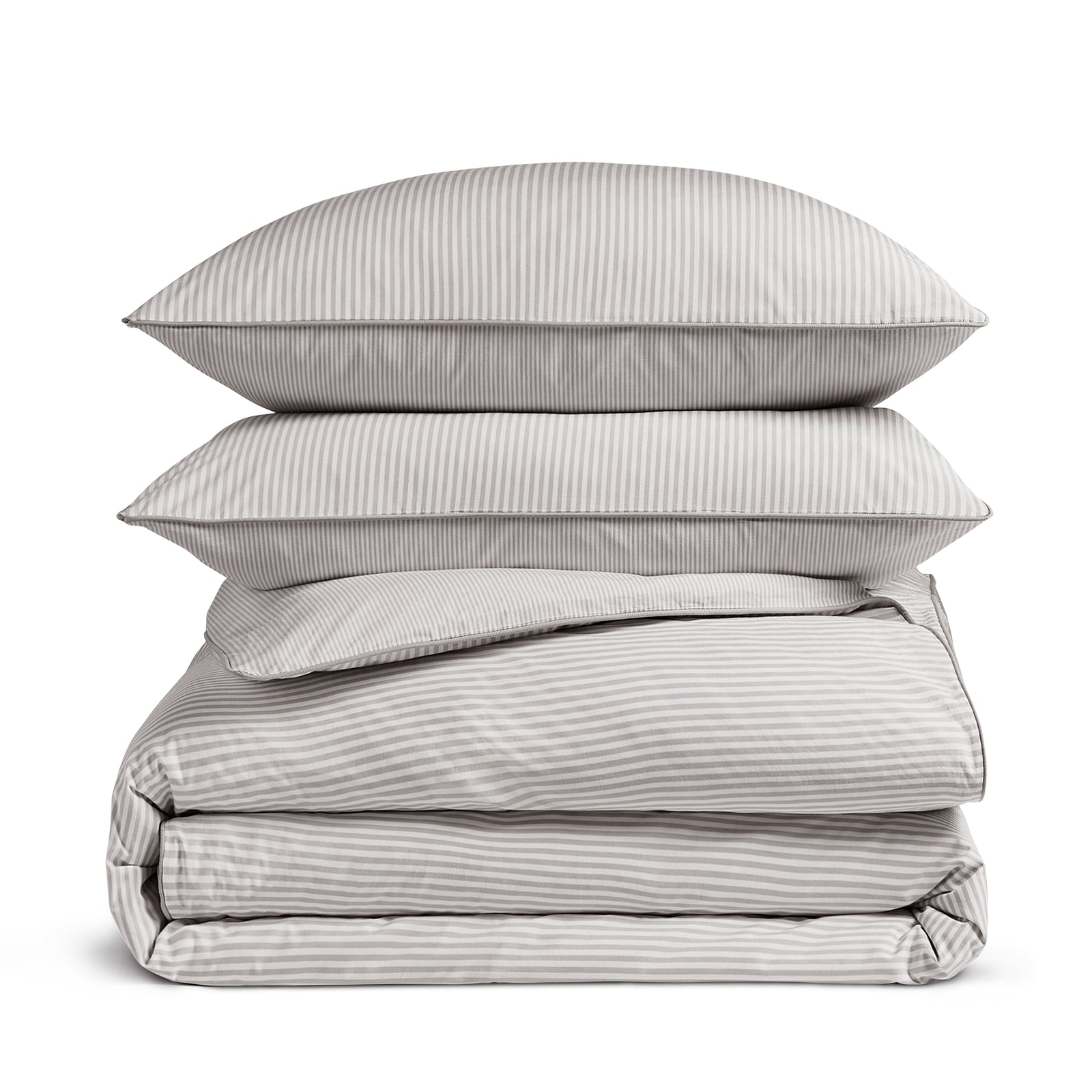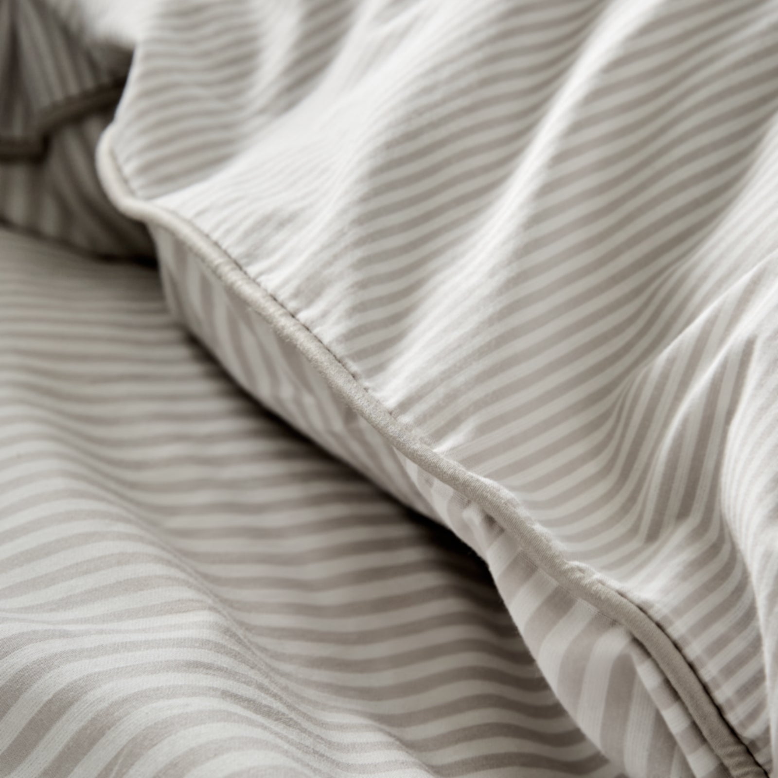 Look forward to your deepest slumbers with this grey striped bedding set. A warm grey with a subtle, sleep-friendly lavender undertone—slow-made from luxury organic cotton.